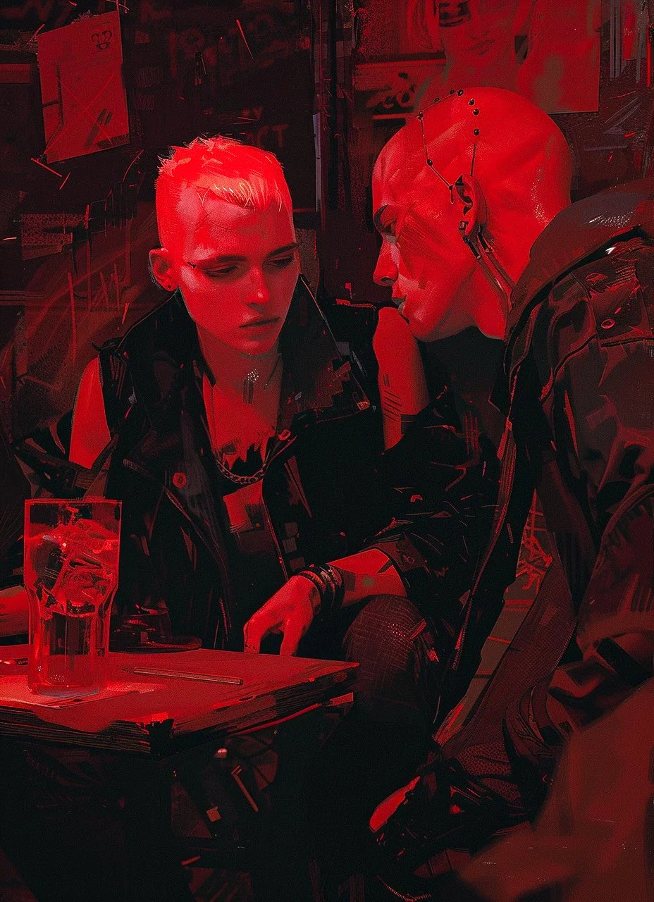 That’s why I’m here, why we’re all here. A gear-runner’s bar, hangout, den, whatever. Heading South; graffiti-covered walls, low lights, neon signs, dark corners and curling smoke. Here we shoot back the pop-skull and wait for a tip. Hard ground, but I’ve pulled enough runs now to show that despite my age and size (and sex to some) my crew and I are as capable as the rest.